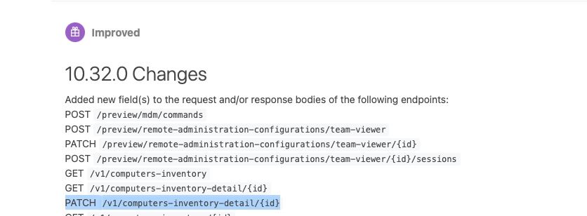 If you look at the Jamf Pro API changelog here, you can see that with version 10.32.0 a change was made to the PATCH /v1/computers-inventory-detail/{id} endpoint. Here is a screenshot of the changelog with the relevant line highlighted.