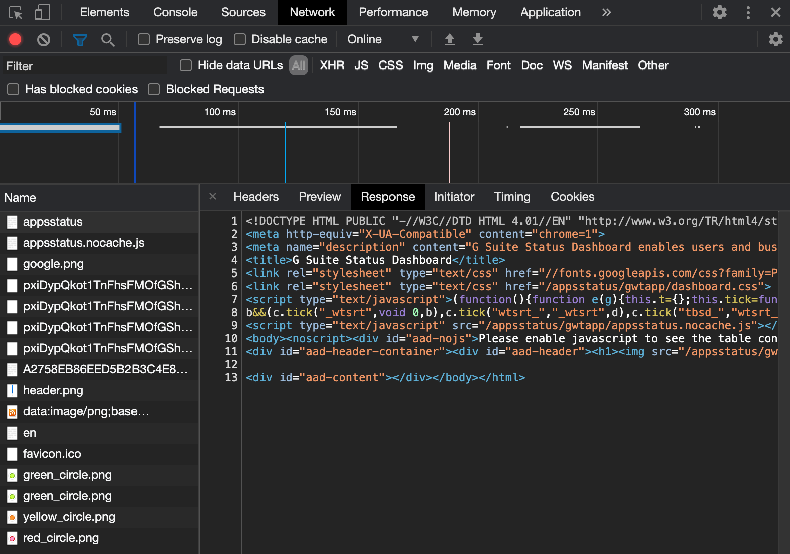 Google has made it very difficult to get the current SaaS status. While most other SaaS service status pages (e.g. Box, Zoom, Lever) offer some form of API call or webhook when the service status changes, for some reason the G Suite Status Dashboard lacks these features. When an API endpoint does not exist, a common approach for fetching service statuses from third-party websites is to parse their HTML DOM using a tool such as Jsoup; this approach, however, does not work for the G Suite Status Dashboard page because it requires JavaScript to be executed in order to see the status div's. As evidence, notice how the server returns an empty aad-content div.