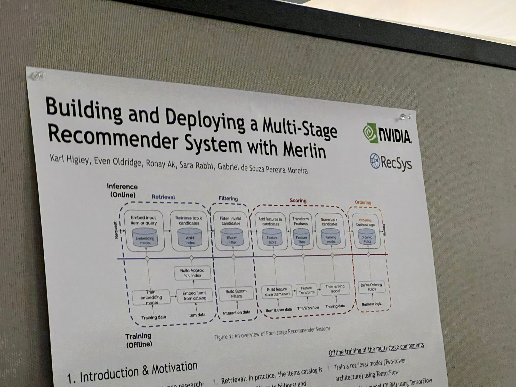 - My coworker Chengyi also attended the conference with me. In his words, "I chatted with several engineers from Google, Amazon and listen to several discussion around poster, overall people are using similar approach / framework to solve the recommendation issue, such as Retreival-Ranking two stage, light path ranking, real-time signal, etc." He also noticed that end-to-end recommender systems latencies were within 200-300ms which is very good.